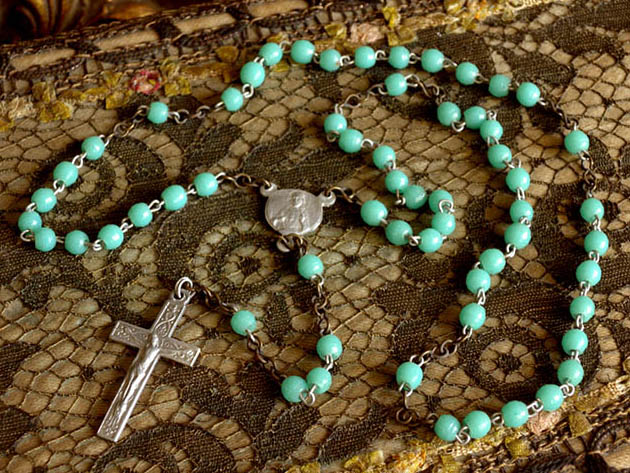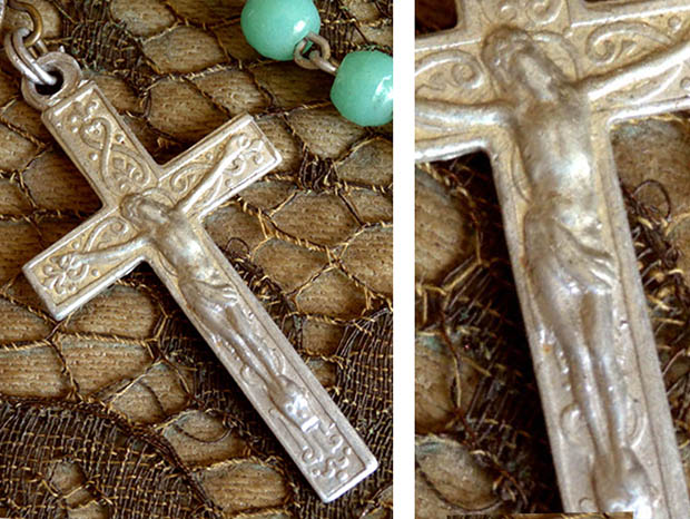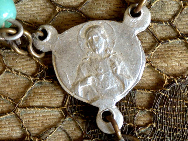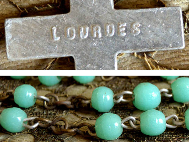 フランス南西部のピレネー山脈のふもとにあるLourdes(ルルド)の町で、おそらく1930年代にスーヴニール(土産物)として製作されたおそらくアリュミオム(アルミニウム)とペルル(ビーズ)で製作されたジェジュ・クリ&ヴィエルジュ・マリー・シャプレクロワです。こちらは超レアなおそらく巡礼者へのスーヴニールとして作られたカトリック教会で聖母マリアへの祈りを唱えるときに使用する祈りの用具のChapelet(シャプレ/ロザリオ)で、アリュミオムとメタル製の鎖のシャプレにはジェジュ・クリ(イエス・キリスト)が張り付けられたクロワ(十字架)とヴィエルジュ・マリー(聖母マリア)とジェジュ・クリのルリエフ(レリーフ)がデザインされたメダイユ(メダル)が付けられていて神聖で厳かでとてもいい感じです。また、裏面にはLourdesのエンボスがありますが、ルルドはピレネー山脈のふもとにあるフランス南西部の町で、1858年に地元の少女がここで薪拾いをしているときに洞窟でヴィエルジュ・マリーを見たという奇跡の地として有名で霊泉のある洞窟を多くの巡礼者が訪れているようです。また、鎖につけられたブルーチュルクワーズ(ターコイズブルー)のペルルも素敵です。また、アリュミオムは、1825年にデンマークの物理学者のハンス・クリスティアン・エルステッドが発見したようですが、純粋なアルミニウムの精練は当時は大変難しくて金よりも高価だったようです。120年以上も前にフランスで作られたものですが、使っても飾っても大変素敵なジェジュ・クリ&ヴィエルジュ・マリー・シャプレクロワです。