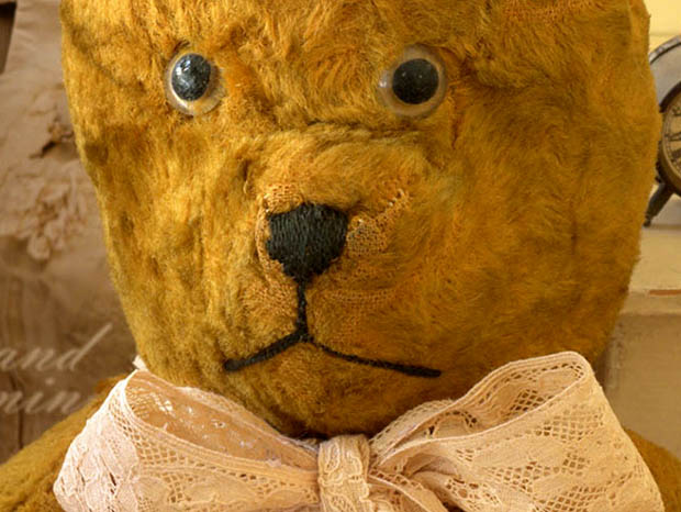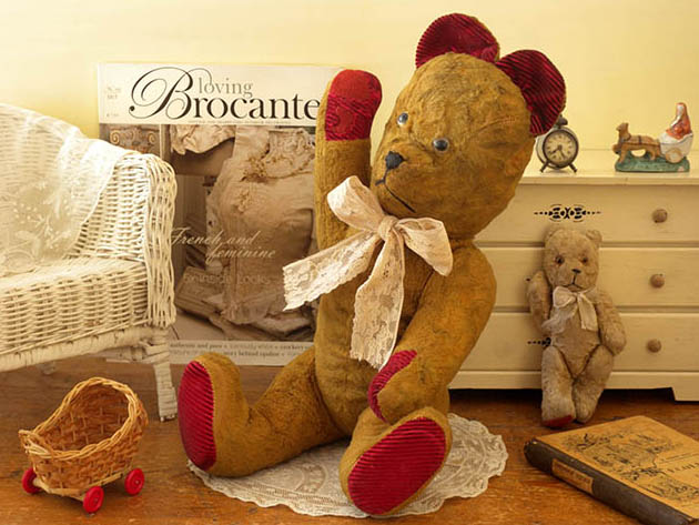 フランスでおそらく1930年代の終わり頃から1940年代に製造されたブルイーター(グロウラー)が内蔵したぬいぐるみのベージュブラン&ボルドー・べべテディウルスです。Teddy Ours(テディウルス/テディベア)は、1902年にアメリカのルーズベルト大統領が熊狩りで傷を負ったウルス(ベア)を逃がしてやったことが評判になったことで、ニューヨークの玩具店がドイツから輸入したウルスのぬいぐるみにルーズベルト大統領の愛称のTeddy(テディ)の名前を付けて売り出したのがテディウルスの始まりのようですが、世界で最初にウルスのぬいぐるみを製作したのはドイツのシュタイフ社のようです。こちらは超レアなベージュブラン(ベージュブラウン)のレーヌ(ウール)で作られたべべ(ベビー)のテディウルスで、淡いロゼ(ピンク)がかったエクリュ(生成り)のお花模様のドンテル(レース)のリュバン(リボン)を首に結んで、つぶらなノワール(ブラック)と透明のガラスの目とノワールの糸で刺繍されたお鼻の下のお口で優しく微笑んでいるような表情がオシャレで可愛くてとてもいい感じです。また、耳の内側と前足と後ろ足のパッドはボルドー(ワインカラー)のヴルール(ベルベット)のような生地で作られているのもオシャレで素敵ですね。また、頭と胴体と前脚と後脚がジョイントされているのでいろんなポーズが付けれますが、ジョイント部分には丸い板紙が取り付けられていて大変作りがいいようです。また、体の中は全て硬いザクザクとした木毛が詰められているようです。また、フランス製のウルスには珍しいブルイーターがお腹の中に内蔵されているようですが、本体を揺らすとカラカラと動きますが今は「グァー」と鳴いてはくれません。また、おそらく1925年からフランスでテディウルスを製造しているFadap(フェダップ)社の製品のようですが、首に掛けられていたFadap Common European Market(ヨーロッパの共通マーケット) Paris ・Divonne(パリ・ディボンヌ)の表示のある厚紙製のタグがないので断定はできません。フランスのテディウルスは人気の高いJPM (ジ・ペ・エム)社のように耳の外側と内側が対照的な色合で作られているものが多いですが、こちらもベージュブランとボルドーの耳の対照的な色合いとノワールのお鼻とお口の色合いがフランスらしくてとてもオシャレですね。フランスから遥々やって来た可愛いべべのテディウルスが傍にいるだけで気持ちが優しく癒されてしまいそうな超レアな大変素敵な一品です。