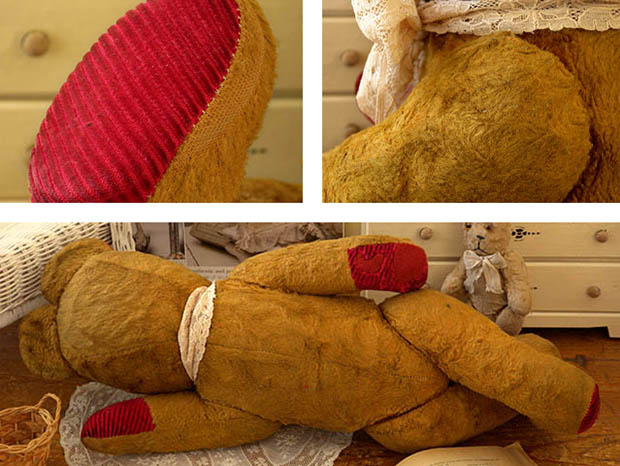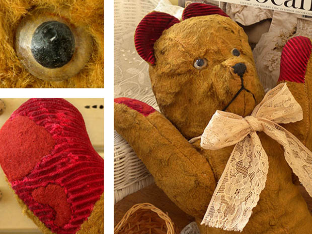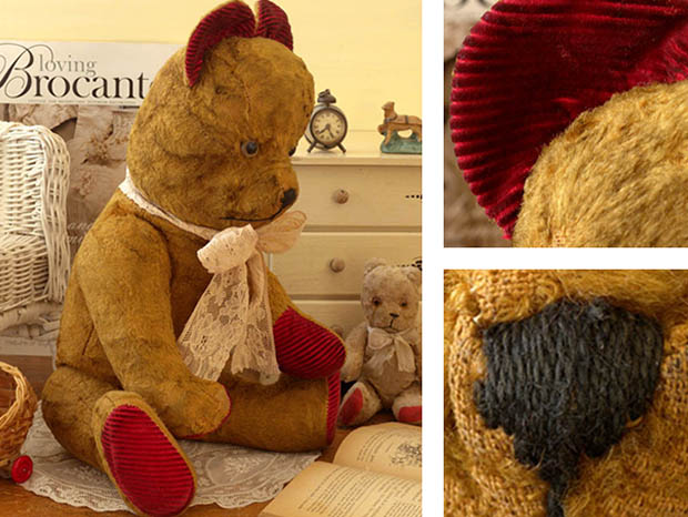 ベージュブランのレーヌに多少の色やけや抜けがありますがとてもきれいです。古いガラスの目なので多少の傷みがありますがヒビや欠けはなくとてもきれいです。お鼻とお口のルージュの刺繍に多少の傷みがありますが切れはなくとてもきれいです。ジョイントに壊れはありません。写真のように右の前足のボルドーのパッドの破れがボルドーのフートゥル(フェルト)の生地で古い時代にとてもきれいに修理されていますが、その他のパッドにほつれや破れはなく大変きれいです。ブルイーターは現状ではカラカラと動きますが「グァー」と鳴きません。リュバンは後から付けられたもので破れはなく大変きれいです。その他、多少の傷みや汚れなどありますがほつれや破れはなく大変状態が良くきれいで、Good Conditionです。