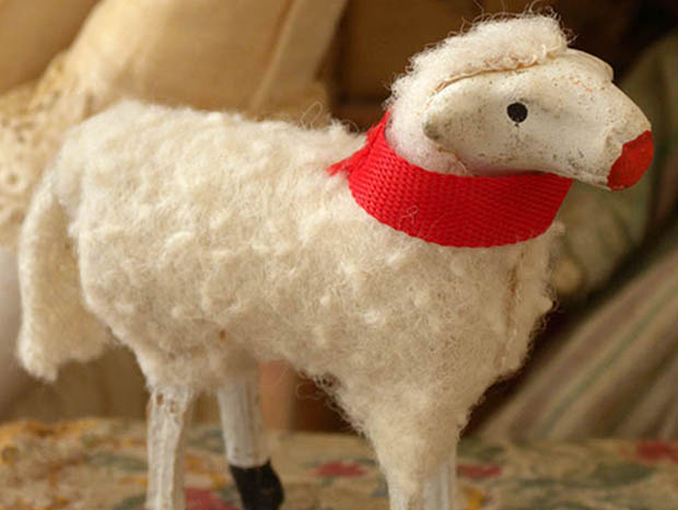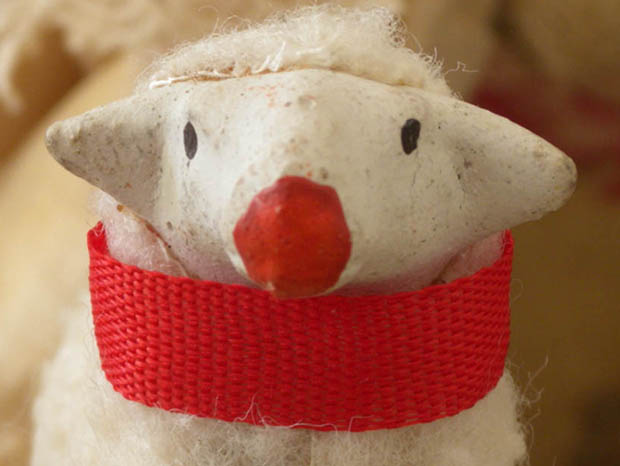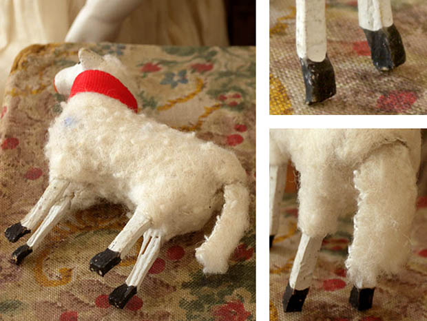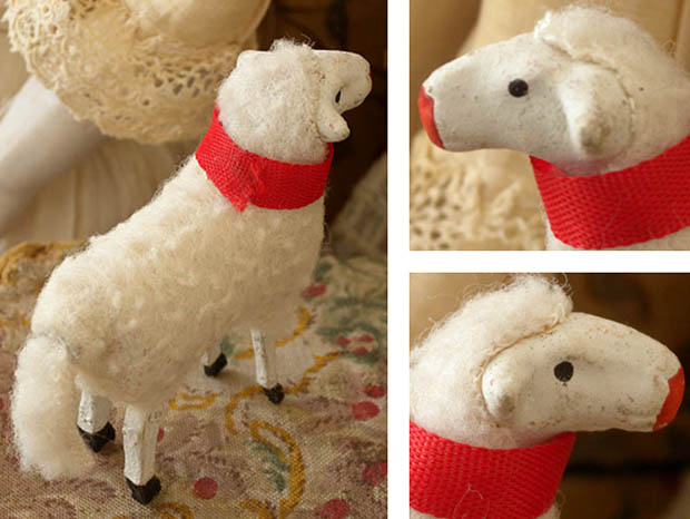 ドイツのドレスデンから南西へ50kmほど行ったチェコとの国境に近いErzgebirge(エルツゲビルゲ/エルツ山地)のSeiffen(ザイフェン)の町で、おそらく1920年代頃に製作された木とコンポジション(おがくずや粘土などをニカワなどで混ぜ合わせて型抜きしたもの)と羊毛で作られたエルツゲビルゲ・ラムフィグーアです。エルツゲビルゲのザイフェンの町では14世紀頃から豊富にある木材から木工品の製作が始まったようで「くるみ割り人形」などが有名なようです。こちらは超レアな小さなサイズのコンポジションの頭と木製の胴体に脚が付いたLamm(ラム/子羊)のフィグーア(フィギュア)で、体には本物の羊毛が貼り付けられています。また、ロート(レッド)のシュライフェ(リボン)を首に巻いて丸いロート(レッド)のお鼻につぶらな黒い瞳でじっとムッティ(ママ)を見ている姿が可愛くてとてもいい感じです。また、お尻のシッポも可愛いですね。おそらく最初はヴァイナハテン(クリスマス)の飾り物に作られたようですが、木製の羊小屋などもあるようなのでいっしょにジオラマで飾ると世界観があって楽しいですね。また、ビスキュイプーペ(ビスクドール)やクロモなどといっしょに飾ってもオシャレですね。優しいローザのお鼻とロートのシュライフェが可愛い本物のように作られた大変可愛いエルツゲビルゲ・ラムフィグーアです。