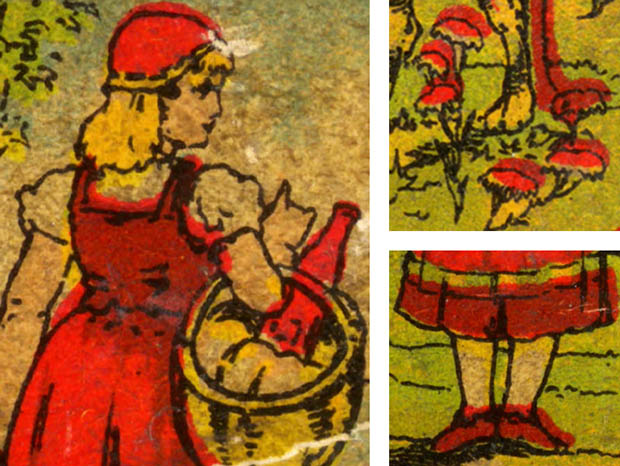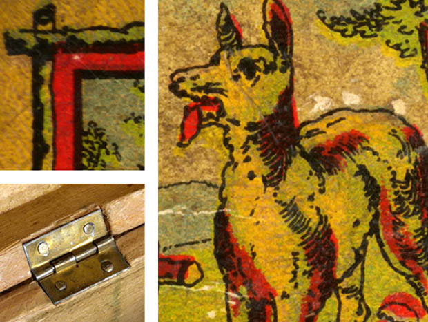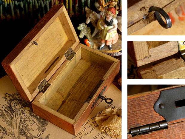 ドイツでおそらく1890年代に製作されたシュリュッセル(キー)付きのホルツ(木)製のロートカピヒェン・シュパーシュヴァインです。こちらは超レアな無垢材で作られてロートブラウン(赤茶)色に塗装されたグリム童話のRotkappchen(ロートカピヒェン/赤ずきんちゃん)のSparschwein(シュパーシュヴァイン/貯金箱)で、ヒンジで開閉するフタには森の家に住んでいる病気のおばあさんにクーヘン(焼き菓子)と葡萄酒が入ったコルプ(バスケット)を届けに行く森の道で親切そうな悪いヴォルフ(オオカミ)に出会ったロートカピヒェンが木の枝の枠の中にデザインされたエチケッテ(ラベル)が貼られていてオシャレで可愛くてとてもいい感じです。また、イラストは高価な発色がいい特色を使った石版印刷で刷られているのもいいですね。また、本体の正面にはシュリュッセルを入れる鍵穴がありますが、穴の周りには装飾的な金属板が取り付けられています。また、フタの背面にも硬貨を入れる横長の穴がありますがこちらにも木部が傷まないように金属板が取り付けられていてとても作りがいいですね。また、本体の正面の内側には金属製のシュペーレン(ロック)が取り付けられていますが、シュリュッセルを鍵穴に差し込んで左に回すとフタが閉まります。また、右に回すとシュペーレンが解除されてフタが開きますが、シュリュッセルは欠損しているものが多いですが、しっかりと付属しているのが嬉しいですね。また、フタと本体の角は全てL字に切り込みを入れた木材でつなぎ合わせた組み木で作られていて強度があり大変作りがいいようです。ロートカピヒェンのお話はフランス人のCharles Perrault(シャルル・ペロー)が1697年に出版した「ペロー童話集」の中にありますが、1812年頃にドイツ人のグリム兄弟がキンダー達のために可愛く書き直して有名になったようです。当時のグリム童話が大好きなキンダー(子供)達がお小遣いを大切に貯金していた可愛いシュリュッセル付きのロートカピヒェン・シュパーシュヴァインです。