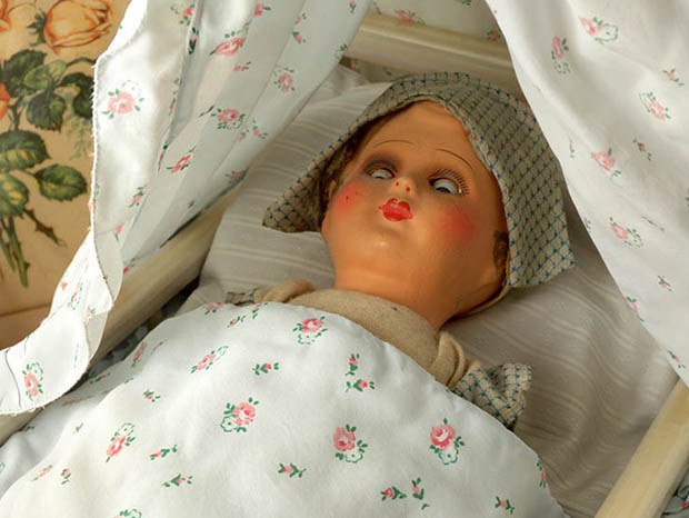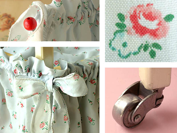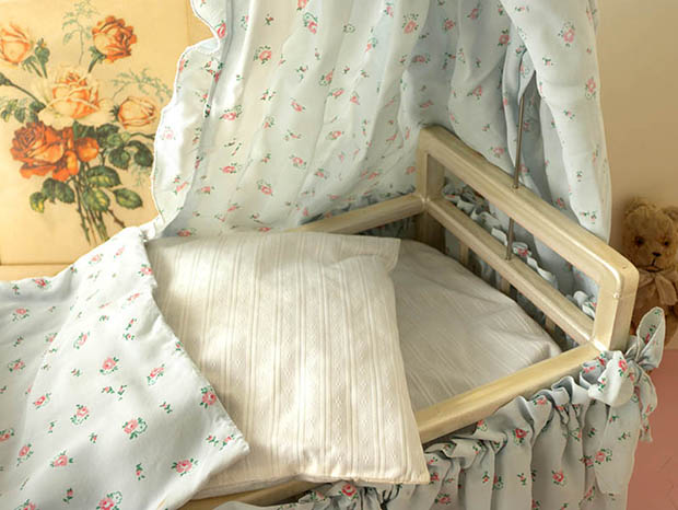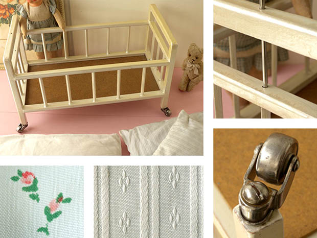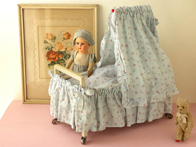 ドイツでおそらく1950年代に製造されたベッツウェッシャー(寝具)と天蓋用のフォーアハング(カーテン)付きの木製のローザローゼシュトッフ・ベービプッペンヒンメルベッツゼッツです。こちらは大変レアなベービプッペ(ベビードール)用の無垢材で作られたHimmelbett(ヒンメルベッツ/天蓋ベッド)のゼッツ(セット)で、淡いゴルト(ゴールド)に塗装された本体の四本の脚には移動に便利なメタル製の車輪が取り付けられています。また、本体の周りにはヘルブラウ(水色)地にローザ(ピンク)のローゼ(ローズ)のお花模様のシュトッフ(生地)のリューシェン(フリル)飾りが付けられているのも素敵ですが、ベッツ(ベッド)の四つの角にはシュライフェ(リボン)が結ばれているのも可愛いですね。また、本体にはエルフェンバインヴァイス(アイボリーホワイト)のマトラッツェ(マットレス)と淡いグラウ(グレー)のお花の縞模様の敷き布団と枕が付属しています。また、ローザのローゼのお花模様のシュトッフのデッケ(ブランケット)も付属しているのも嬉しいですね。また、先端にロート(レッド)の木製のお飾りが付いた針金の支柱の天蓋にはローザのローゼのお花模様のシュトッフのフォーアハング(カーテン)が掛けられていますが、お気に入りのベービプッペを寝かせてあげるとロマンチックでオシャレで可愛くてとてもいい感じです。また、床板は厚い板紙で作られていてとてもしっかりとした作りです。また、小さなテディベアなどを寝かせてあげてもとても可愛いですが、プッペンシュトーベ(ドールハウス)の雰囲気で家具などといっしょに飾るともっと世界観があって可愛くなりそうですね。ドイツは昔からプッペンシュトーベやモヴェヤー(家具や調度品)の製造で有名ですが、可愛いヒンメルベッツは見ているだけで少女時代の楽しい思い出に気持ちが優しく癒されてしまいそうな大変素晴らしい一品です。(少女とテディベアは付属しません)