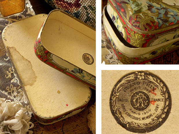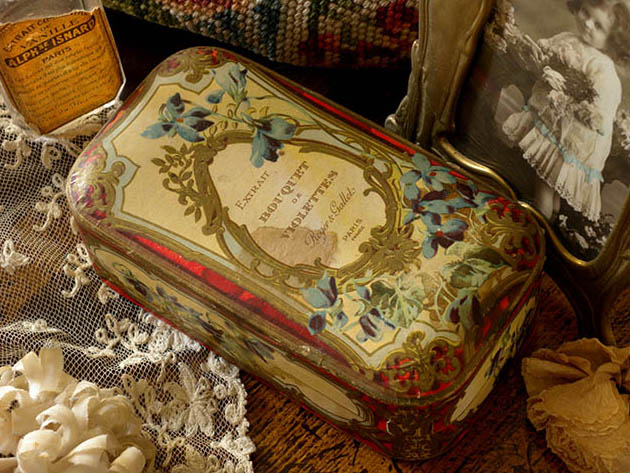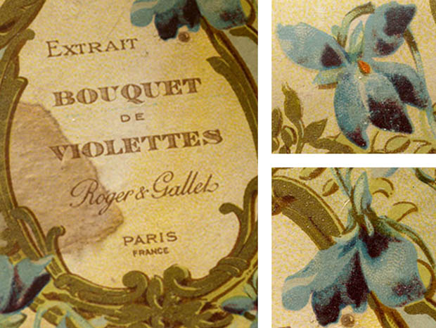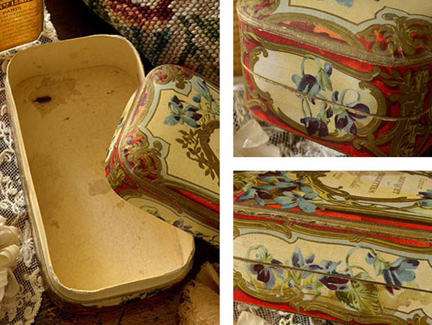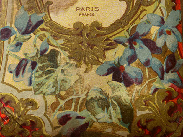 この年代のパルファンボワットは状態の良いものは少ないですがイラストの発色が良くとてもきれいです。フタと本体に少しパルファンの汚れがありますが、フタを開けるとまだヴィオレットのパルファンの香りがします。その他、多少の傷みや汚れなどありますが破れはなくとても状態が良くきれいで、Good Conditionです。