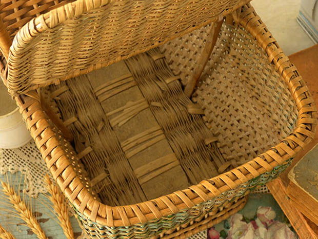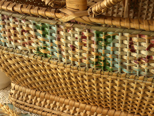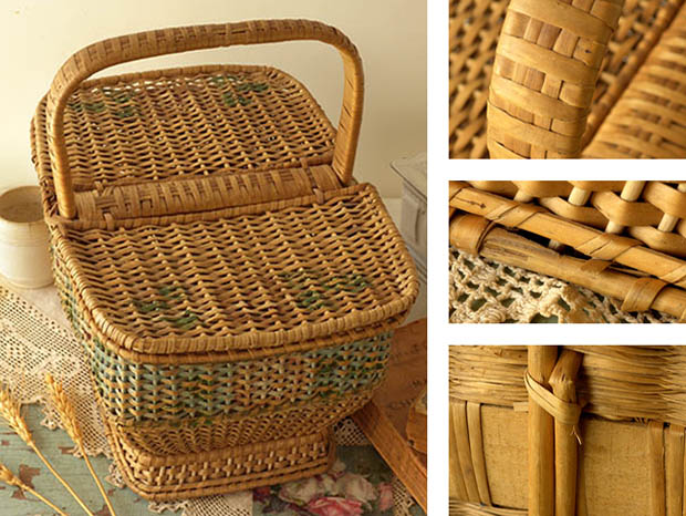 ローズのお花とオールの彩色の発色が良くてとてもきれいです。ヒンジに壊れはなくフタはスムーズに開閉します。写真のように本体の下部のロタンに多少の欠けが一箇所あります。ロタンに色焼けがありますが飴色になった木肌がとてもいい雰囲気です。フタと本体に虫食いの跡はなくとてもきれいです。その他、多少の傷みや彩色の剥がれや汚れなどありますが欠けはほとんどなく壊れもなく大変状態が良くきれいで、Good Conditionです。