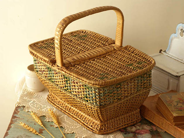 フランスでおそらく1920年代にロタン(ラタン)で製作されたルージュローズ・ピクニックロタンオジエパニエです。こちらは超レアなおそらく大きなサイズから四番目のサイズのロタンのオジエ(編み込み)で作られた持ち手の付いたピクニック用のPanier(パニエ/バスケット)で、丁寧に編まれた本体の上部には使いやすいヒンジで開閉する両開きのフタがありますが、ルージュ(レッド)のローズのお花が手描きでペイントされています。また、本体の側面にもオール(ゴールド)のトリムとボーデュア(ボーダー)柄のルージュのローズのお花が手描きでペイントされていてオシャレで可愛くてとてもいい感じです。また、飴色になったロタンもとてもいい雰囲気で素敵ですね。きっと家族でピクニックに行くときにママンが作った美味しそうなカスクルート(サンドイッチ)やアンファン達が大好きなお菓子などを入れるのに使ったのかも知れませんね。もうピクニックパニエとして使う人はいないかもしれませんが、小さなテディウルス(ベア)などのぬいぐるみやプーペ(ドール)を入れたり工夫次第でいろいろと楽しく使えそうです。とても丁寧に作られた凝ったデザインのロタンオジエパニエですが、コレクターズアイテムとして人気が高いので状態の良いものはフランスでも高価で大変入手が難しくなってきているようです。また、こんなに状態の良いものは大変珍しくて大切に保存されていたようです。見ているだけで当時のお出かけにはしゃいでいるアンファン達の可愛い姿が想像できそうなフランスらしい大変オシャレで素敵な一品です。