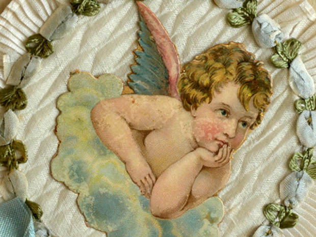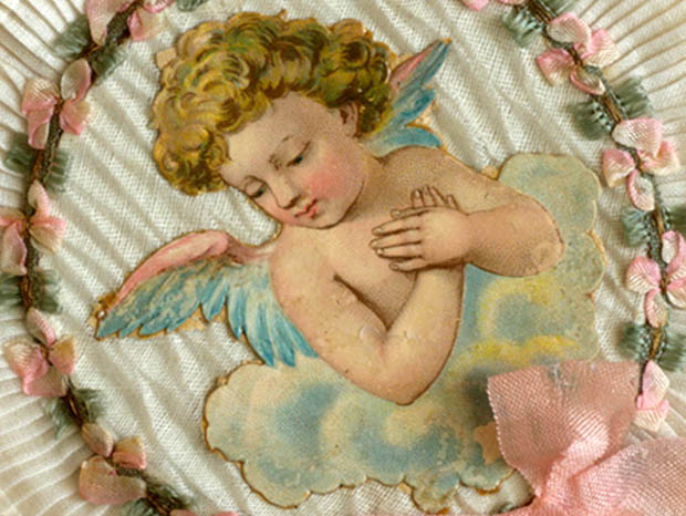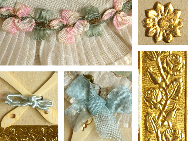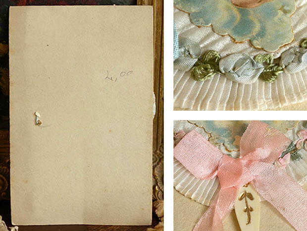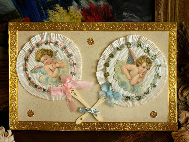 フランスでおそらく1930年代頃にビスキュイプーペ(ビスクドール)用に製作されたデッドストックのセルロイドと生地と厚紙製のアンジュ・プーペエクラン2アンサンブルです。こちらは超レアなビスキュイプーペ用の丸いフォルムのEcran(エクラン/団扇)の2個のアンサンブル(セット)で、厚紙製の台紙のフチにはにはローズのお花模様がエンボスされた金紙が貼られていますが、マルグリート(マーガレット)のお花のような金紙も貼られていてとても素敵です。また、台紙には2個のエクランが取り付けられていますが、エクランの扇部分は厚紙製でその上にイヴォワールブランシュ(アイボリーホワイト)の生地が貼られていて周りはリューシュ(フリル)飾りのように作られていてとてもオシャレです。また、リューシュ飾りの内側には左側のエクランは優雅なロココ調のアマンド(アーモンド)のお花をイメージしたようなロゼ(ピンク)とヴェール(グリーン)の可愛いロココリュバン(リボン)が付けられています。また、右側のエクランにもローズお花をイメージしたようなブルークレール(水色)とヴェールの可愛いロココリュバンが付けられていてとても素敵です。また、エクランの中央には雲の上で羽を広げて両腕を胸に当ててお祈りしているようなアンジュ(天使)と羽を広げて顎に手を当てて物思いにふけっているアンジュのクロモも貼られていてエレガントでオシャレで可愛くてとてもいい感じです。また、ロゼとブルークレールのリュバン(リボン)が結ばれたイヴォワール(アイボリー)のセルロイドの持ち手にはオールのアラベスク模様のエンボスがあり大変凝った作りです。また、こんなに状態がいいので大切に保存されていたようです。お気に入りのビスキュイプーペといっしょに飾るととても素敵な大変可愛い一品です。