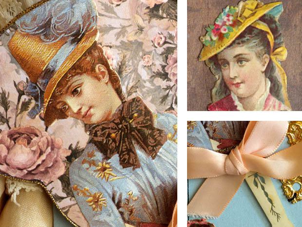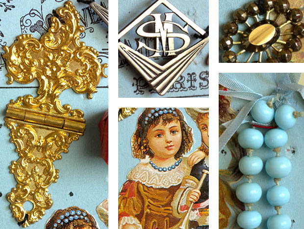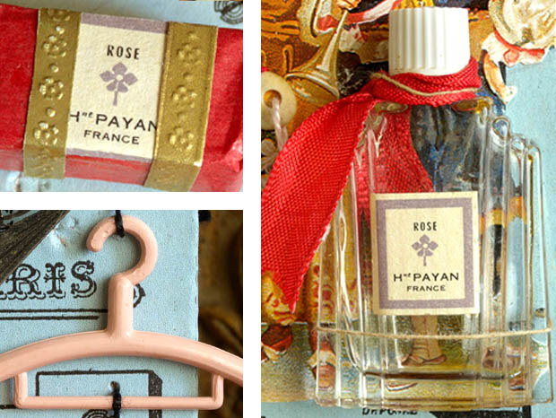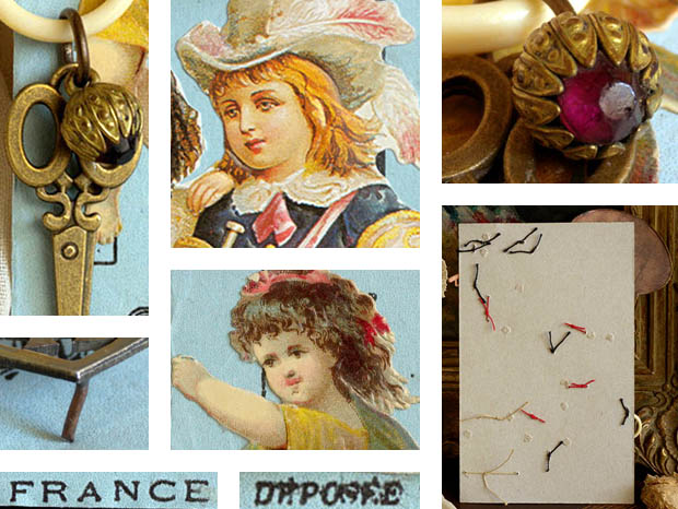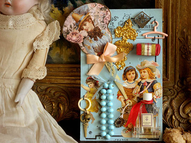 フランスで1910年代から1950年代頃のジュモーやシモン&ハルビッヒなどのビスキュイプーペ(ビスクドール)用の小物を使っておそらく1950年代に作られたほとんどデッドストックのマドモアゼルエクラン・プーペアクセスソワー11アンサンブルです。こちらは超レアなブルーパール(ペールブルー)の台紙に細いカウチュ(ゴム)紐と紐で留められたPoupee Accessoires(プーペアクセスソワー/ドールアクセサリー)の11個のアンサンブル(セット)で、台紙の左上からロゼ(ピンク)のローズのお花模様の背景に亜麻色の髪にブルークレール(水色)のリュバン飾りの付いたシャポー(帽子)をかぶってジョーヌ(イエロー)のお花柄のブルークレールのローブ(ドレス)を着たマドモアゼルがデザインされたEcran(エクラン/団扇)がありますが、裏面はブランフォンセ(ダークブラウン)の水墨画の風景のような背景にお花飾りの付いたジョーヌのシャポーをかぶってロゼのローブを着たフィーユ(少女)のクロモが貼られていてとても素敵です。また、エクランの周りはオール(ゴールド)で縁取りされていますが、淡いソモンロゼ(サーモンピンク)のリュバンと淡いロゼの紐が結ばれたセルロイドの持ち手にはアラベスク模様が透し彫りのようにデザインされていて大変凝った作りです。また、その横には真鍮に金メッキされたアラベスク模様のルリエフ(レリーフ)が豪華なヒンジが付けられた木製のビジューコフレ(宝石箱)などに使われるFermoir(フェルモア/留め金)がありとてもオシャレで素敵です。また、その横には菱形のメタル製の革の鞄のフタの正面などに取り付けるイニシャルのDecoration(デコラシオン/飾り物)がありますが、本体にはMSのイニシャルと下部には斜めにレイユール(ストライプ)模様がルリエフ(レリーフ)でデザインされていて大変凝った作りです。また、その横にはロゼのプラスチック製の可愛いCintre(サントル/ハンガー)があります。また、その下にはRose(ローズ) Honore Payan(オノレ・パヨン) France(フランス)と書かれたエティケット(ラベル)が貼られた香水で有名なGrasse(グラース)社のおそらくサヴォン(石鹸)が包まれたオールとルージュ(レッド)の紙包みがありとても素敵です。また、左端にはイヴォワールのセルロイドの輪っかに真鍮製のシゾー(ハサミ)と蕾のようなフォルムの中にリュビ(ルビー)ようなボープルルージュ(パープルレッド)のガラスの宝石が付けられたChatelaine(シャトレーヌ)の小物がありとてもオシャレです。また、その横にはブルーパール(ペールブルー)のリュバンが結ばれた美しいパステルブルーのペルル(ビーズ)が付いたCollier(コリエ/ネックレス)があります。また、その横には真鍮製の15個のキラキラと光るディアマントシュニット(ダイヤモンドカット)されたお花のようなフォルムのDecorationがあります。また、その横には香水で有名なグラース社のRose Honore Payan Franceと書かれたエティケットが貼られた香水が入っていたブランシュのプラスチックのフタにルージュのリュバンが結ばれたオシャレなガラス製のParfum Flacon(パルファンフラコン/香水瓶)があります。また、台紙には豪華な宝石のコリエを付けたり羽飾りのシャポーをかぶって素敵な民族衣装を着たブランシュのお花が入ったパニエ(バスケット)を持ったフィーユとラッパを持ったギャルソン(少年)のChromo(クロモ)、亜麻色の髪に花飾りを付けてジョーヌのローブを着たフィーユのクロモが貼られていてどれもデザインクオリティーが高くてエレガントでオシャレで可愛くてとてもいい感じです。また、台紙の下部にはFrance(フランス)とDeposee(登録商標)の表示があります。こちらはおそらくパリにあるビスキュイプーペ(ビスクドール)を販売しているお店が、ビスキュイプーペの小物を見繕って制作して販売していたもののようですが、フランスのジュモーやなどのビスキュイプーペは大変作りが良くて高額なので、そのビスキュイプーペが持つアクセスソワーも本物のように大変凝った作りのものが多いのですね。お気に入りのビスキュイプーペと飾りたい超レアな大変素晴らしい一品です。