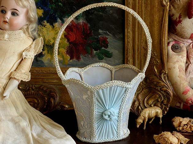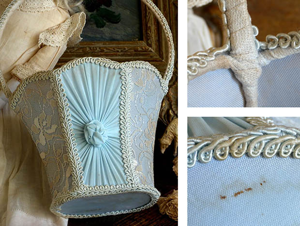 フランスでおそらく1940年代にジュモーやシモン&ハルビッヒなどのビスキュイプーベ(ビスクドール)用にレーヨンと木綿のティッシュ(生地)と針金で作られたブルークレールティッシュローズ・プーペパニエです。こちらは超レアな貴婦人用のブドワール(淑女の私室)にあるビスキュイプーベなどに持たせるために作られたPanier(パニエ/バスケット)で、上部は楕円のような六角形で下部は左右が半円の長方形にデザインされていてとても素敵です。また、太い針金で骨組みが作られた本体には大きな持ち手が付けられていてとても持ちやすそうです。また、本体と持ち手にはブルークレール(水色)の柔らかなレーヨンのティッシュが張られていますが、本体の左右の側面にはイヴォワールブランシュ(アイボリーホワイト)のチュールドンテル(レース)にお花模様が刺繍されたドンテルで覆われていてとてもオシャレです。また、本体の正面と背面の中央にはブルークレールの生地のプリエ(ひだ)飾りとローズのお花のようなコサージュが付けられていてエレガントでオシャレで可愛くてとてもいい感じです。また、持ち手と本体の上部と下部のフチにはブルークレールの豪華な組紐飾りが付けられているのも素敵ですね。ビスキュイプーベは19世紀のヨーロッパのブルジョワのマドモアゼルやマダム達の間で流行ったでプーペ(ドール)で、Biscuit(ビスキュイ)はお菓子のビスケットと同じように「二度焼き」が語源のようです。ビスキュイプーベはとても高価ですが、そのプーペが手に持つこちらのパニエも手抜きのない作りで本物のように手が込んでいます。ビスキュイプーベ以外にもテディウルス(ベア)などといっしょに飾ったりすると楽しみがどんどん増えていきそうですね。お気に入りのプーペに持たせるだけでプーペ達がもっと可愛くなってしまいそうな超レアな大変素晴らしい一品です。