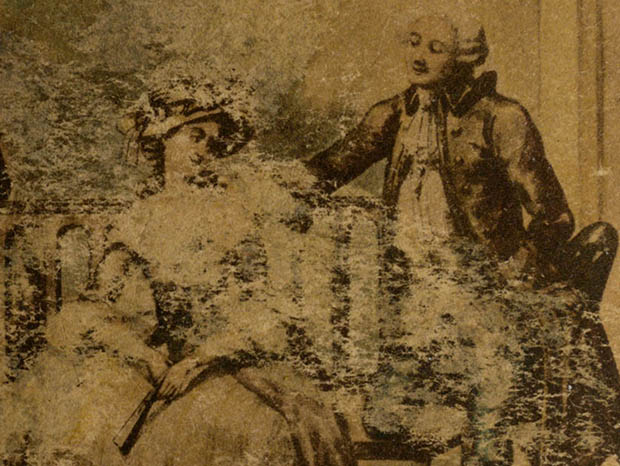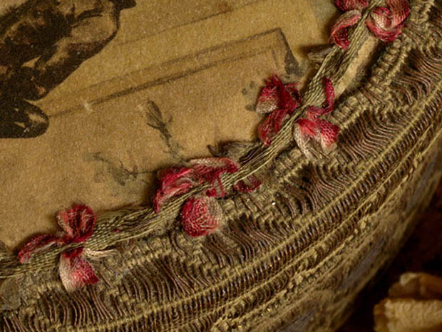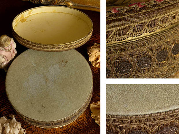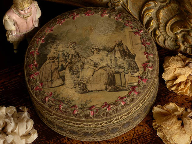 フランスでおそらく1880年代に厚紙にロココリュバン(リボン)と布地の織物が貼られて作られたロゼ&ルージュフルールロココリュバン・ブドワールアクセソワーコフレです。こちらは超レアなおそらく貴婦人が書き物をしたりお化粧や着替えをするための夫でさえ入室できない婦人専用のBoudoir(ブドワール/淑女の私室)で使われていたフタのあるおそらく大切なAccessoires(アクセソワー/アクセサリーなどの服飾用品)の収納用に作られた円柱形のCoffret(コフレ/小箱)で、オール(ゴールド)のフタの表面のフチには豪華なオールのラメが入ったようなブランフォンセ(ダークブラウン)の糸で織られたアラベスク模様の布地が貼られているのも素敵ですが、優雅なロココ調のロゼ(ピンク)とルージュ(レッド)のフルール(お花)のような可愛いロココリュバンがギルロンド(ガーランド)のように付けられていて大変凝った作りです。また、中央には貴族のお屋敷のお庭で執事とお話をしているお花飾りの付いたシャポー(帽子)をかぶって豪華なローブ(ドレス)を着て椅子に座ったポンパドール夫人のような貴婦人と素敵なムッシュと楽しそうにお話をしている美しいシャポーとローブを着た二人のマドモアゼル達のまるで18世紀のロココ時代のフラゴナールが描いた装飾的で甘美な絵画のようなイラストがデザインされていてエレガントでオシャレでとてもいい感じです。また、オールの本体の側面にもオールのラメが入ったようなブランフォンセの糸で織られたアラベスク模様の布地が貼られていて大変豪華な作りです。また、フタの裏側と本体の中はイヴォワールブランシュ(アイボリーホワイト)の化粧紙が貼られています。また、ブランフォンセのエティケット(ラベル)が貼られていましたが破れて欠損しています。また、底面には淡いグリ(グレー)の化粧紙が貼られています。当時のアクセソワーコフレは使いやすいだけでなく装飾品のように美しくてオシャレなのでお部屋にあるだけで素敵ですね。当時のパリに住むブルジョワのマドモアゼルやマダム達の気分でオシャレに使いたい大変素晴らしい価値ある一品です。
