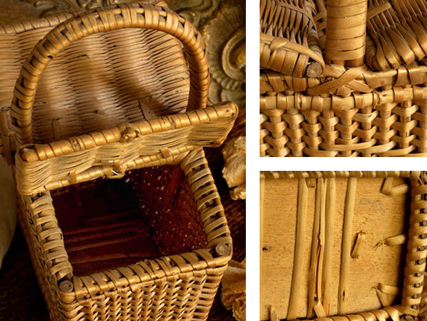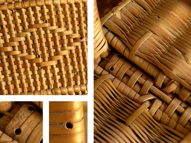 飴色になったロタンの木肌がとてもいい雰囲気です。ロタンに傷みが少なく大変きれいです。フタの留め具の一箇所と本体の留め具の二箇所が欠損しています。ヒンジ部分に壊れはなくフタはスムーズに開け閉めできます。持ち手の内側と持ち手の付け根部分の本体などに多少の虫食いの穴がありますが、穴は幼虫が成虫になって出て行ったという証で中に虫はいないようです。その他、多少の傷みや汚れなどありますが壊れはなくとても状態が良くきれいで、Good Conditionです。