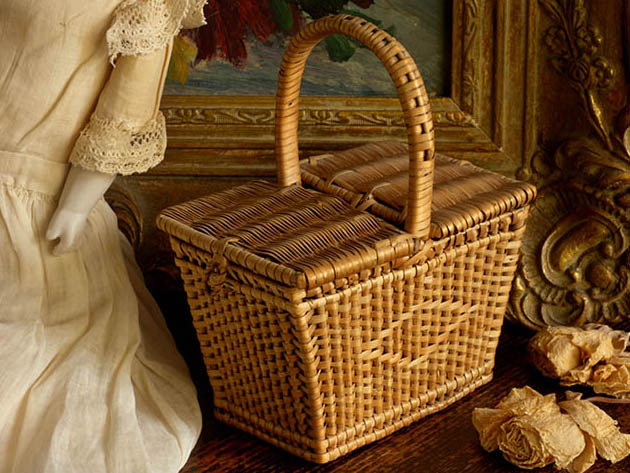 フランスでおそらく1920年代にジュモーやシモン&ハルビッヒなどのビスキュイプーベ(ビスクドール)用に製作されたプーペピクニック・ロタンオジェパニエです。こちらは超激レアなロタン(ラタン)のオジエ(編み込み)で製作されたプーペ(ドール)用の四角いピクニック用のおそらく一番小さなサイズのPanier(パニエ/バスケット)で、丸く曲げられた大きな持ち手部分や両開きのフタなど本物のピクニックパニエと同じようにとても丁寧に作られていますが、本体の正面と背面の中央部分はロタンで編み込みを少し変えてロザーンジュ(菱形)模様がデザインされていてオシャレで可愛くてとてもいい感じです。また、左右のヒンジで開け閉めできるフタと本体にはそれぞれ留め具が付けられていて大変凝った作りです。ビスキュイプーベは19世紀のヨーロッパのブルジョアのマドモアゼルやマダム達の間で流行ったで人形で、Biscuit(ビスキュイ)はお菓子のビスケットと同じように「二度焼き」が語源のようです。ビスキュイプーベはとても高価な人形ですが、そのプーペが手に持つこちらのピクニックパニエも手抜きのない作りで本物のように手が込んでいますね。ビスキュイプーベ以外にもテディベアなどといっしょに飾ったりすると楽しみがどんどん増えてきそうですね。また、四角いプーペピクニックパニエは大変珍しくて中々お目にかかれませんが、小さくて可愛い超激レアな大変素晴らしい一品です。