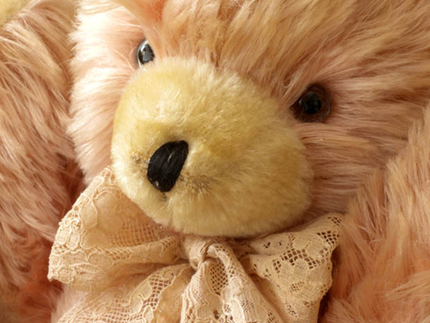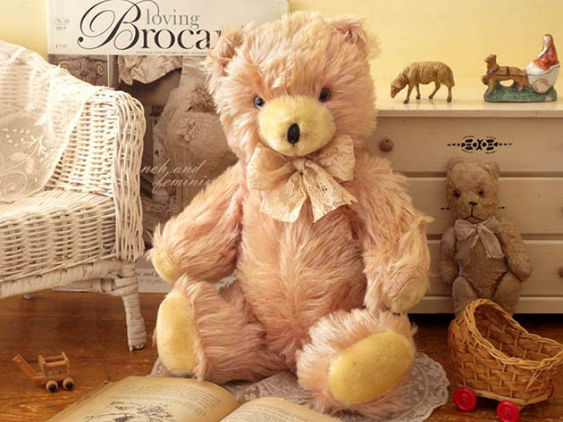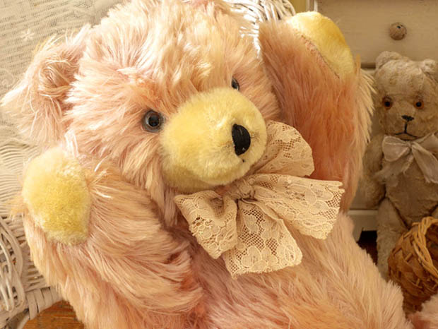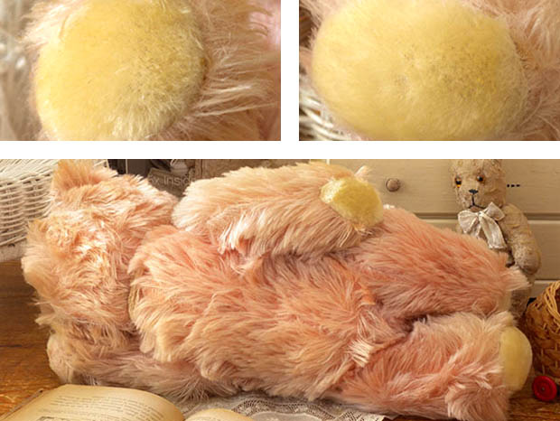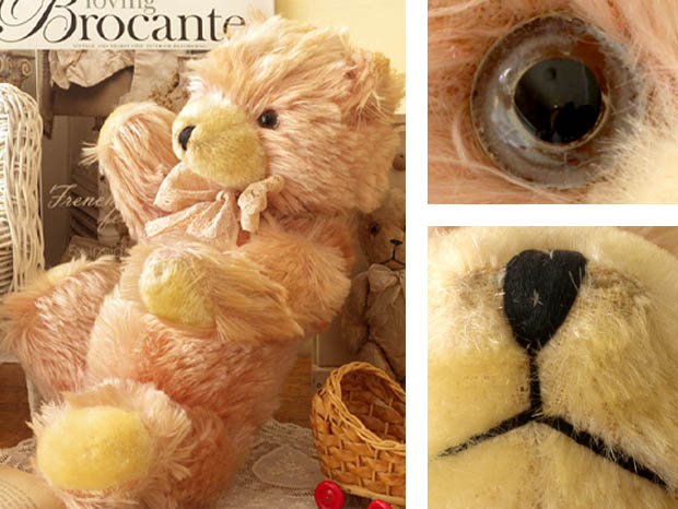 ドイツでおそらく1940年代の終わり頃に製造されたぬいぐるみのラックスローザ&エルフェンバインモヘア・テディベアです。Teddybar(テディベア)は、1902年にルーズベルト大統領がベアハンティングで傷を負ったベアを逃がしてやったことが評判になったことで、ニューヨークの玩具店がドイツから輸入したベアのぬいぐるみにルーズベルト大統領の愛称のTeddy(テディ)の名前を付けて売り出したのがテディベアの始まりのようですが、世界で最初にベアのぬいぐるみを製作したのはドイツのシュタイフ社のようです。シュタイフ社はおそらく1900年頃からベアのぬいぐるみの製造をは始めているようです。こちらは超レアな首にベージュローザ(ベージュピンク)色のお花模様のシュピッツェ(レース)のシュライフェ(リボン)を結んだラックスローザ(サーモンピンク)の高級なモヘアで作られた鼻スジが長いトラディショナルフォルムのテディベアで、つぶらなシュヴァルツ(ブラック)と透明なガラスの目と毛足の短いクリーム色のモヘアの鼻スジの先端のシュヴァルツの糸で刺繍されたお鼻の下のお口で優しく微笑んでいるような表情がオシャレで可愛くてとてもいい感じです。また、エルフェンバインのヴォレの耳も可愛いですね。また、頭と胴体と前脚と後脚が針金でジョイントされているのでいろんなポーズが付けれますが、ジョイント部分には丸い板紙が取り付けられていてとてもしっかりとした作りです。また、体の中には木毛が詰められているので押すとザクザクした硬い感触があります。また、前足と後ろ足にはクリーム色の毛足の短いモヘアのパッドが縫い付けられていますが、シュヴァルツの糸の爪は元から付けられていないベアのようです。また、布タグはありませんが、布タグは1950年代の中頃から付けられるようになりこの時代のテディベアには首には厚紙製のタグが掛けられていたようです。ドイツの歴史のある鼻スジが長いトラディショナルなフォルムのラックスローザのテディベアが傍にいてくれるだけで気持ちが優しく癒されてしまいそうな超レアな大変可愛い一品です。