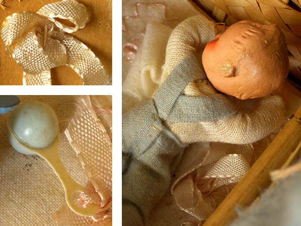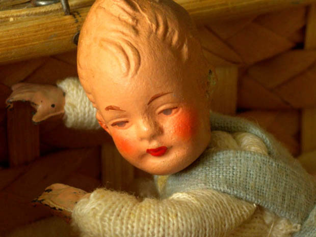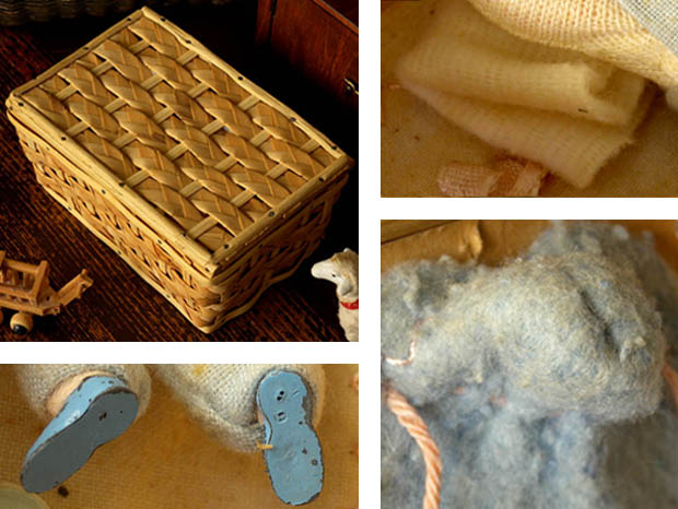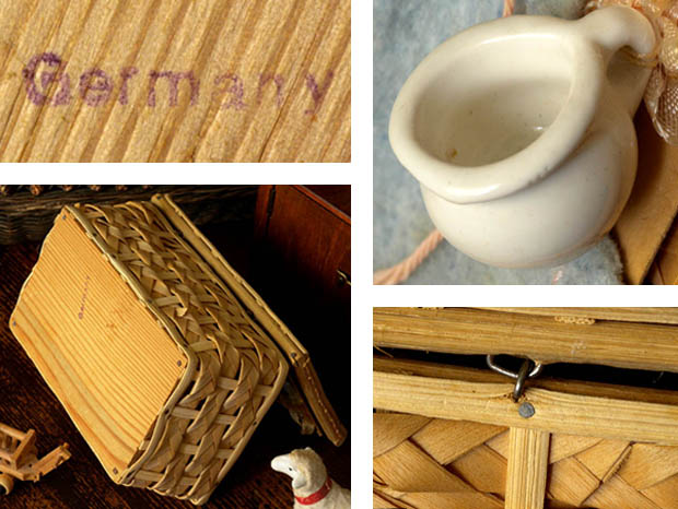 ベービのプッペと衣類などの小物に多少の傷みや汚れがありますが壊れはなくとてもきれいで全て糸でコルプに固定されています。コルプのラタンの欠けはほとんどなく飴色になった木肌が大変きれいです。その他、多少の傷みや汚れなどありますが欠けや割れや壊れはなく大変状態が良くきれいで、Good Conditionです。