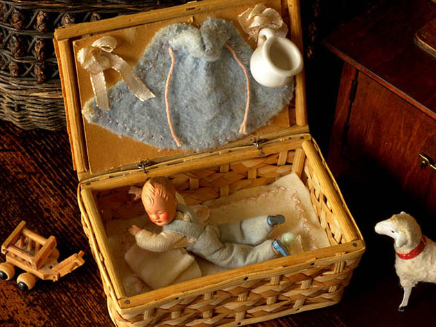 ドイツのニュルンベルクから北へ90kmほど行ったチェコとの国境に近いコーブルクの町にあるFritz Canzler Coburg(フリッツ・カンツラー・コーブルク)社が、おそらく1950年代に製造したポルツェラン(ビスク・磁器)とラタン製のベービプッペ&クライドゥング・プレゼンタティオンラタンコルプゼッツです。フリッツ・カンツラー・コーブルク社は、ベルリンでFritz Canzler(フリッツ・カンツラー)が1910年頃にプッペとプッペ用の衣服の製造をしたのが始まりのようです。その後、テューリンゲン州のゾンネベルクの町で1924年にHans Hoffmann(ハンス・ホフマン)と共同でCanzler & Hoffmann(カンツラー&ホフマン)社を創設したようでなので、カンツラー&ホフマン社はCaho(カホ)の愛称で呼ばれていたようです。また、1952年にはフリッツ・カンツラーがコーブルクの町でフリッツ・カンツラー・コーブルク社を新たに創設したのでCaho(カホ)の愛称はCaco(カコ)に改称されたようです。こちらは超レアなポルツェラン製のベービ(ベビー)のプッペ(ドール)とクライドゥング(衣類)などが付属したラタンで作られたフタがメタル製のヒンジで開け閉めできる四角いフォルムのPrasentation Korb(プレゼンタティオンコルプ/プレゼンテーションバスケット)のゼッツ(セット)で、コルプ(バスケット)はラタンの骨組みに薄いラタンの編み込みで作られていてとても素敵です。また、底面は無垢材で作られているのでとてもしっかりとした作りです。また、底面にはGermanyの表示があります。また、フタを開けるとフタの裏側に貼られた厚紙にはクリーム色のシュライフェ(リボン)と水色のフランネルのカプッツン(フード)付きのお包みと白い陶器製のトップフヒェン(おまる)が飾られています。また、本体の中には周りがローザ(ピンク)の糸でジグザクに刺繍されたベージュの木綿のマッテ(マット)が敷かれていてエルフェンバイン(アイボリー)のシュトリッケン(ニット)のプローヴァー(セーター)に淡いヴラウグラウ(ブルーグレー)の木綿のオーバーオール(サロペットパンツ)を着てヴラウ(ブルー)の靴を履いたポルツェラン製のベービが折り畳んだエルフェンバインヴァイス(アイボリーホワイト)のフランネルのデッケ(ブランケット)の上にうつむせに寝かされていてオシャレで可愛くてとてもいい感じです。また、マッテの上には水色とエルフェンバインのプラスチック製のラセル(ラトル)とクリーム色のシュライフェも取り付けてあるのも可愛いですね。このままお部屋に飾ると見ているだけで気持ちが優しく癒されてしまいそうな大変可愛くて素晴らしい一品です。(コルプの外にある羊と車輪の付いた玩具は付属しません)