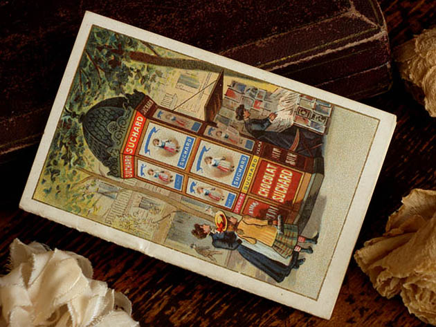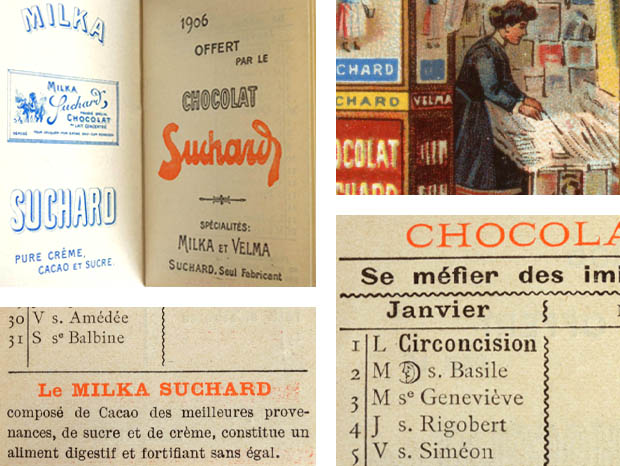 スイスのNeuchatel(ヌーシャテル)州のSerrieres(セリエール)の町で1826年にPhilippe Suchard(フィリップ・シュシャール)が創設したChocolat Suchard(ショコラ・シュシャール)社が、1905年にショコラ(チョコレート)の広告宣伝用に制作したほとんどデッドストックの厚紙製のショコラ・シュシャール・カランドリエミニアチュールリーブルです。フィリップ・シュシャールは、1823年までベルンの兄の菓子店で働いていましたが、1825年にヌーシャテルで菓子店を開き1826年にショコラ・シュシャール社を創設してショコラ(チョコレート)の製造を始めたようです。こちらは超激レアな1906年用の表紙を入れて36ページある小さなカランドリエ(カレンダー)がデザインされたMiniature Livre(ミニアチュールリーブル/ミニチュアブック)で、本体の表面にはパリの街角の広告塔に貼られたショコラ・シュシャール社のアフィッシュ(ポスター)を見ているママンと娘のイラストがデザインされていてオシャレで可愛くてとてもいい感じです。また、裏表紙にはChocolat Extra Fondant(エクストラスムースチョコレート)の文字とショコラのお店の裏道で楽しそうに遊んでいる二人のギャルソン(少年)のイラストがデザインされているのもオシャレです。また、イラストは高価な全て特色を使った石版印刷で刷られているので何年経っても発色がよくて素晴らしいですね。また、表紙の裏にはMilka(ミルカ) Suchard Chocolat, pure creme, cacao et sucre(純粋なクリーム、ココア、砂糖)と書かれているようですが、ミルカはショコラ・シュシャール社が1901年に新たに作ったショコラ・オ・レ(ミルクチョコレート)のマルク(ブランド)のようです。また、最初のページには1906 Offert Par le Chocolat Suchard(1906年にショコラ・シュシャールが提供)と書かれているようです。また、カランドリエは1906年の1月1日の月曜日から12月31日の月曜日までデザインされています。また、Quelques Mots sur les Etablissments Suchard a Serrieres. Serrieres, universellement counu par sa fabrique de chocolat, est situe a une demi-heure de Neuchatel dans une entaille profunde du massif jurassien(セリエールのスシャールの店について。チョコレート工場で広く知られるセリエールは、ヌーシャテルから 30 分ほどのジュラ山脈の深い谷間にあります)、Exiger Toujours La Veritable Marque Suchard. Exiger Sur Toutes Les Tablettes Le Nom Suchard(本物のスシャールブランドをお選び下さい。全てのチョコレートバーに「スシャール」のロゴが入っていることを確認して下さい)などとも書かれているようです。パリの街角の広告塔に貼られたショコラ・シュシャール社のアフィッシュを見ているママンと娘の姿がとても可愛い1905年に制作されたショコラ・シュシャール社の超激レアな大変貴重な一品です。