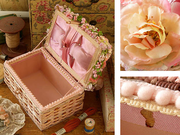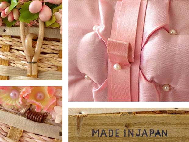 ジャパンでおそらく1960年代に製造されてアメリカに輸出されたローズ&カメリアフラワーズ・ピンクソーイングバスケットです。こちらは超レアなヒンジでフタが開け閉めできるSewing Basket(ソーイングバスケット/裁縫箱)で、フタの中央には高級素材の淡いサーモンピンクのラフィアが巻かれたラタンの持ち手が付けられています。また、フタと本体の正面にはラタンが中に入ったベージュのビニールの留め具が付けられています。また、フタと本体は淡いサーモンピンクのラフィアとキラキラと光る赤味が強いシルバーのビニール素材と薄い無垢材の板の編み込みで作られていてとても素敵です。また、フタにはピンクとレッドのローズのお花とピオニー(シャクヤク)の白いお花とカメリア(椿)のサーモンピンクのお花とマダガスカル・ペリウィンクル(ニチニチソウ)の白いお花とピンクのヒペリカムの実とコーサドッグウッド(山法師)の実などの沢山の布花が付けられていてエレガントでオシャレで可愛くてとてもいい感じです。また、フタを開けるとフタの裏側には光沢のあるピンクのシルクのような生地が張られていますが、中にはふかふかの綿が詰められています。また、シザー(ハサミ)などを留めるためのベルトが付けられているのも便利です。また、本体のフチに貼られたピンクのリボン飾りも可愛いです。また、本体の内側はフタと同じピンクのシルクのような生地が張られていますが、その内側には型抜きで成型されたサーモンピンクのプラスチック素材のような底が深いトレーが入れられていてとても凝った作りです。また、フタと本体の骨組みと底面はしっかりとした無垢材で作られていますが、底面には木目調の化粧紙が貼られています。また、化粧紙にはMade in Japanの表示があるのもいいですね。とても使い勝手のいいソーイングバスケットですが、ソーイングバスケット以外にもオシャレな小物入れとしても色々と楽しく使えそうです。また、とても機能的に作られているのでとても使いやすそうですが、装飾品のように美しくてオシャレなのでお部屋にあるだけで素敵ですね。お部屋に置かれているだけでお部屋がとても華やいだ雰囲気になってしまいそうな大変美しい一品です。