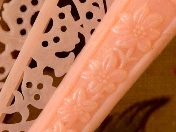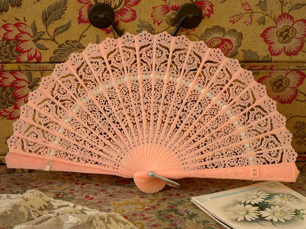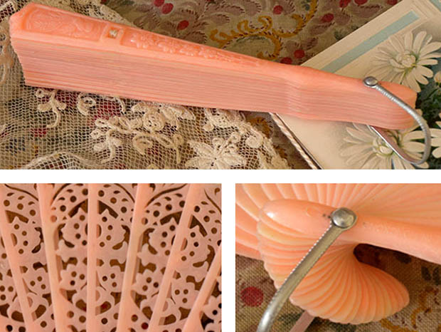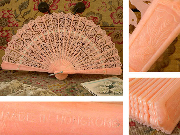 ホンコンでおそらく1950年代にビスクドール用に製作されたほとんどデッドストックのプラスチック製のピンクマーガレット&ディア・ドールフォールディングファンです。こちらは大変レアなピンクの24枚のプラスチック製の親骨と中骨がイヴォワール(アイボリーのリボンでつながれたFolding Fan(フォールディングファン/扇子)で、本体を広げると中骨の扇面にはディア(鹿)のような動物と豪華なアラペスク模様が透し彫りのようにデザインされていてエレガントでオシャレで可愛くてとてもいい感じです。また、左右の親骨にはマーガレットのようなお花がレリーフでデザインされているのも素敵です。また、要は銀色のアルミニウムで作られています。また、本体にはMade in Hong Kongのエンボスがあります。フォールディングファンは遠い昔にチャイナからジャパンに伝わったようですが、折りたたみができるフォールディングファンはジャパンで発明されたようです。また、16世紀頃になるとポルトガル人がジャパンのフォールディングファンをヨーロッパに伝えると王族や貴族の淑女達の間で大変流行してフランスなどでも独自に製作されるようになったようです。お気に入りのビスクドール用といっしょに飾るととても素敵なピンクマーガレット&ディア・ドールフォールディングファンです。