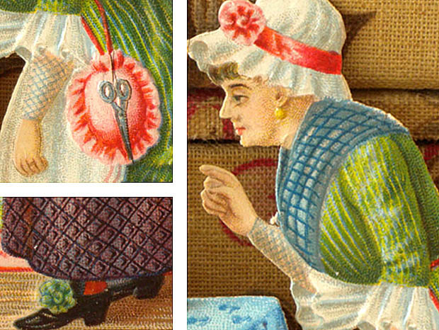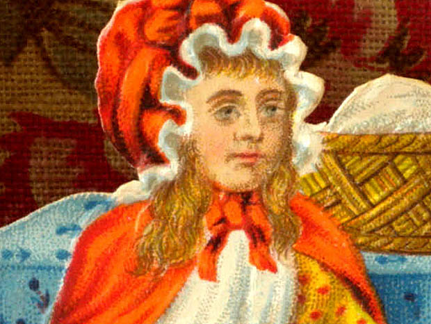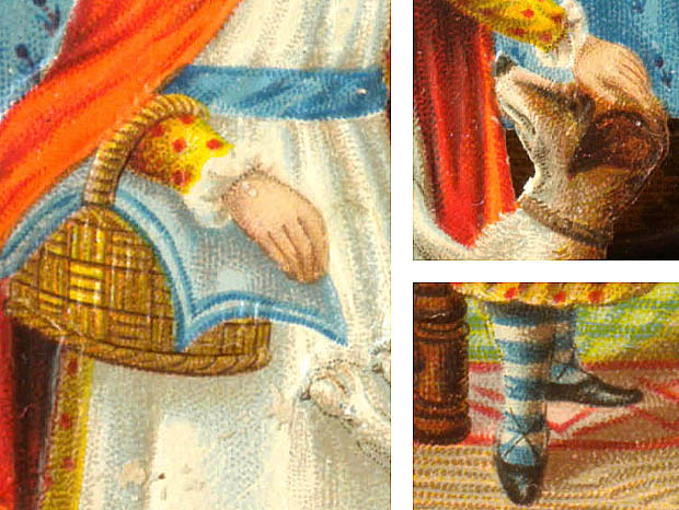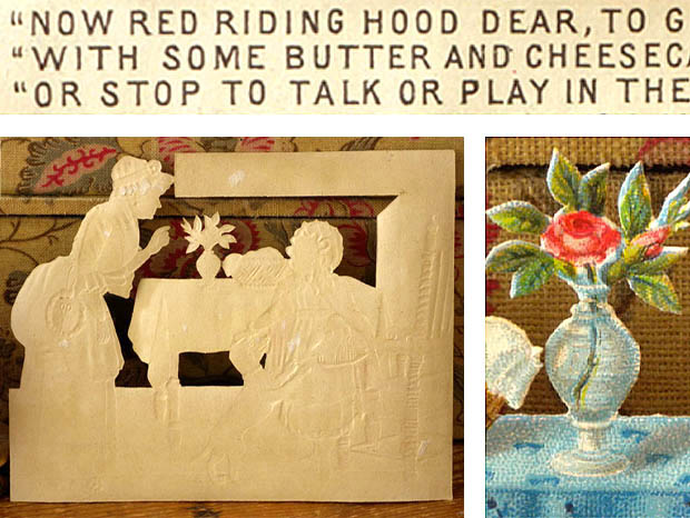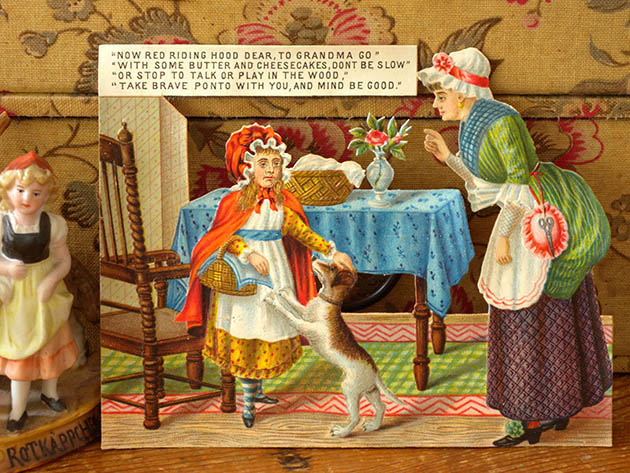 イギリスでおそらく1900年代に製作されたほとんどデッドストックの厚紙製のレッドライディングフード&ウルフ・トレーディングカードNo.1です。こちらは超レアなRed Riding Hood(レッドライディングフード/赤ずきんちゃん)の楽しいお話の場面のイラストがデザインされたNo.1のTrading Card(トレーディングカード/鑑賞用のコレクションカード)で、ダイカットされた表面にはNow Red Riding Hood dear, to Grandma go. With some butter and cheesecakes dont be slow or stop to talk or play in the wood. Take brave ponto with you, and mind be good.(さあ、赤ずきんちゃん急いでおばあさんの家にバターとチーズケーキを持って行くのよ。でも、森で道草したりお話ししたり遊んだりしちゃだめよ。あなたは勇敢でとてもいい子なんだから)のお話と家の中でバターとチーズケーキの入ったバスケットを抱えて愛犬の頭を撫でながらマミーのお話を聞いているレッドライディングフードですが、ちょっぴり不安そうな表情のイラストがデザインされていてオシャレで可愛くてとてもいい感じです。また、お部屋の中の調度品もとても細やかに描かれていてとてもいい雰囲気で素敵です。また、全て高価な特色を使った発色がいい石版印刷で刷られていますが、立体的なエンボス加工もしてありとても凝った作りです。レッドライディングフードのお話はフランス人のCharles Perrault(シャルル・ペロー)が1697年に出版した「ペロー童話集」の中にありますが、1812年頃にドイツ人のグリム兄弟がチャイルド達のために可愛くリメイクしてから有名になったようです。ダイカットスクラップを見ているだけでレッドライディングフードの可愛い世界に引きずり込まれてしまいそうな超レアな価値ある一品です。