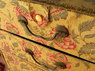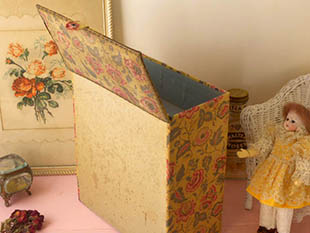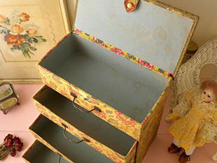 フランスでおそらく1920年代に製作された板と板紙にティッシュ(生地)が貼られたロゼローズベージュティッシュクチュールボワットです。こちらは超レアな四段のティロワール(引き出し)が付いたクチュールボワット(裁縫箱)で、上段のティロワールはイミテーションで下の三段のティロワールが引き出せます。上部正面のベージュのブトンプレッション(スナップボタン)を外すと上部はヒンジで開閉するフタになっていてティロワールと同様に小物の収納に使えてとても凝った作りです。板と板紙の本体と板紙のティロワールにはベージュ地にアールヌーヴォーのアラベスク模様でロゼのローズのお花がデザインされたティッシュが貼られていてエレガントでオシャレでとてもいい感じです。また、ティロワールにはアールヌーヴォーの湾曲にデザインされた真鍮製の取っ手が付いているのもオシャレですね。また、上部のフタの内側と中とティロワールの内側にはブルーグリ(ブルーグレー)の化粧紙が貼られているのもオシャレです。フランスのクチュールボワットはティロワールだけのものが多いですが、天面がヒンジで開閉するフタがついたタイプは大変珍しくて超レアですね。沢山のクチュールの小物を収納できるのでとても使い勝手が良さそうですが、クチュールボワットだけでなくフランスのアンティークの小物を仕舞うのにもとても便利です。また、ビスキュイプーペ(ビスクドール)のローブ(ドレス)などを収納するコモッド(整理タンス)として使ってもオシャレです。当時のフランスのクチュールボワットは使いやすいだけでなく装飾品のように美しくてオシャレなのでお部屋にあるだけで素敵ですね。当時のパリのアパルトマンに住むマドモアゼルやマダム達の気分でオシャレに使いたい素晴らしいロゼローズベージュティッシュクチュールボワットです。
